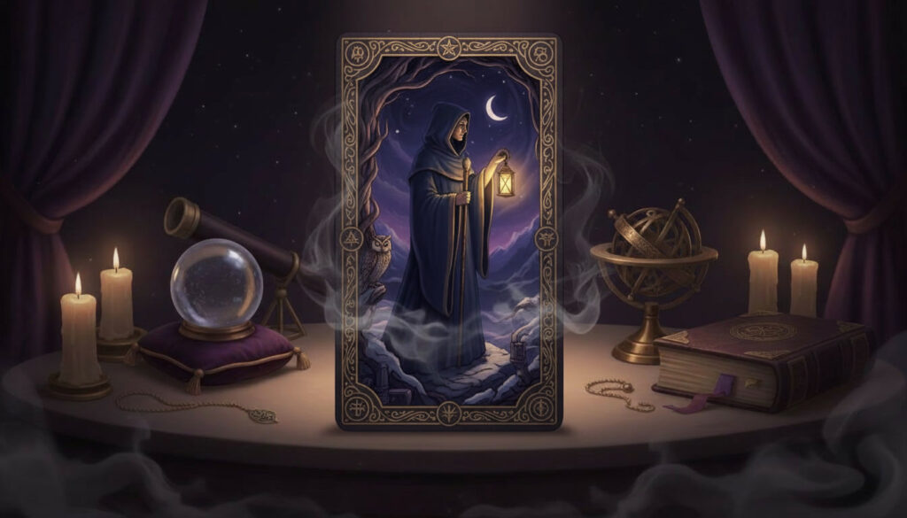 L’Hermite (IX) est un vieillard solitaire tenant une lanterne allumée et un bâton de pèlerin. Il avance lentement dans l’obscurité, éclairant son propre chemin.