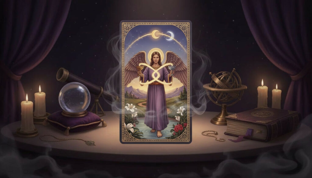 Elle incarne l’équilibre, la modération, la guérison intérieure, l’alchimie des contraires. Tempérance apaise, mélange, fluidifie ce qui était figé ou brûlant. Son interprétation varie : paix retrouvée et santé dans un contexte harmonieux ; excès ou déséquilibre dans un tirage plus tendu. Elle nous enseigne que l’harmonie est un art actif, pas un état naturel.