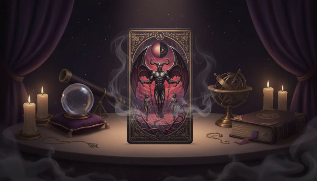 Cette lame parle de passions intenses, de dépendances, de pouvoir, de sexualité brute, d’ombre à intégrer. Elle révèle ce qui nous enchaîne : peurs, addictions, relations toxiques ou désirs refoulés. Selon le contexte, elle annonce une libération possible ou une emprise plus forte. Le Diable nous invite à regarder notre ombre en face : elle est aussi source de puissance.