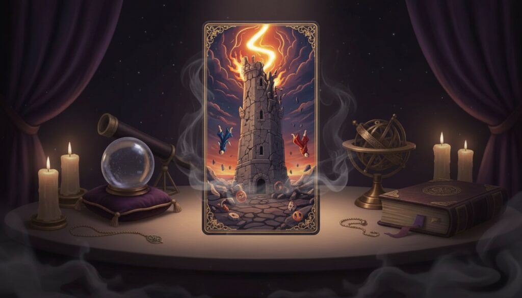 La Maison Dieu (XVI) montre une tour frappée par la foudre, deux personnages éjectés, la couronne qui tombe. Rupture brutale, libération soudaine.