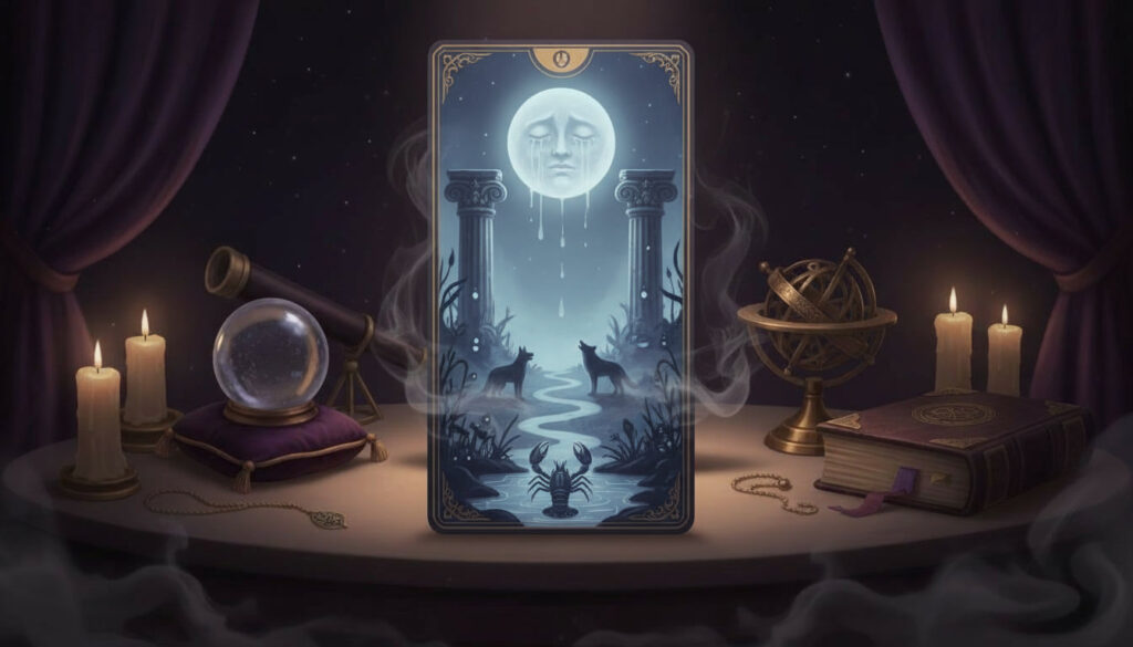Elle représente l’inconscient, les rêves, les peurs cachées, les cycles féminins, la sensibilité exacerbée. La Lune invite à naviguer dans l’ombre avec confiance. Son interprétation varie : intuition puissante et prémonitoire dans un tirage clair ; confusion, mensonges ou angoisses dans un contexte plus trouble. Elle nous enseigne que la lune éclaire même dans l’obscurité.
